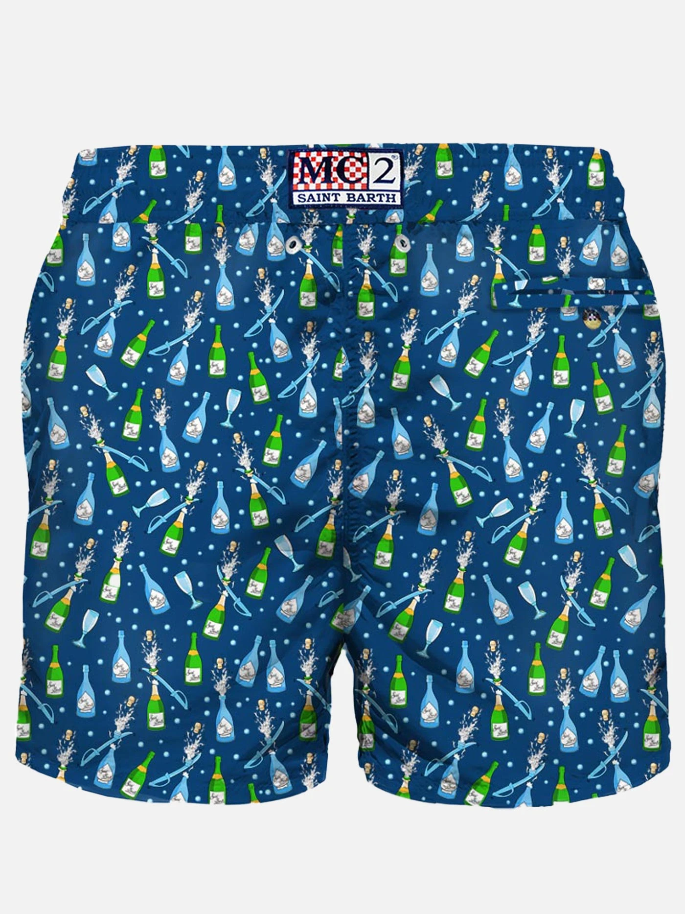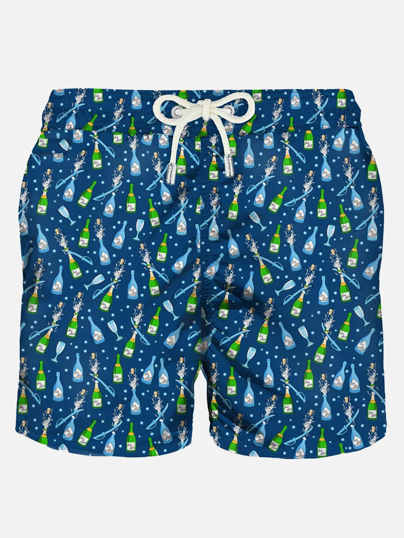 Man’s classic swim short, miniĀ bottles Ā print, light fabric, quick drying, mid-lenght, light net lining, elasticated waistband, drawstring fastening, front and back pocket with button.