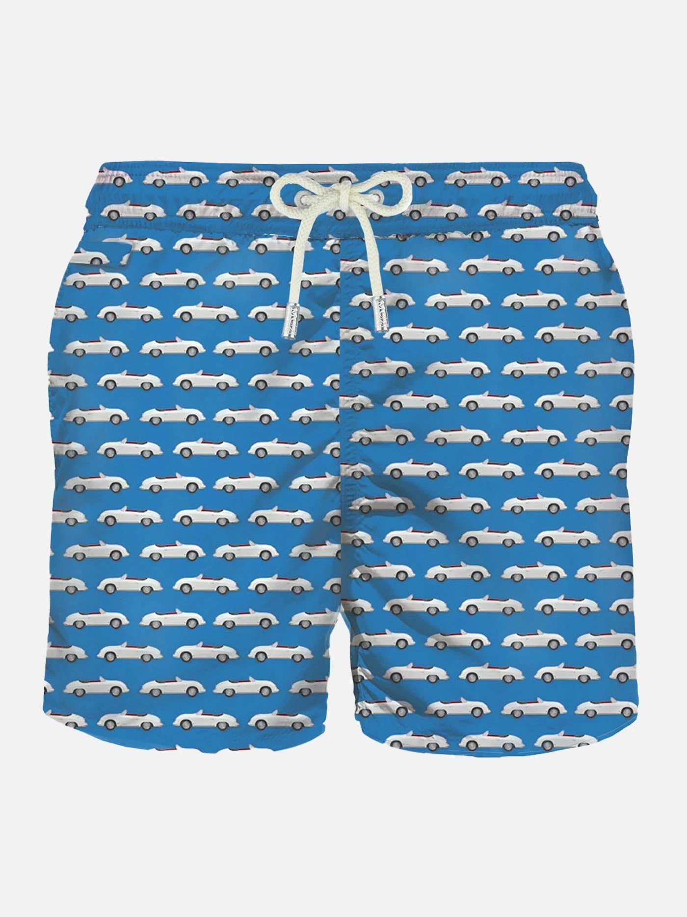 MC2 Saint Barth man’s classic swim short, white micro cars all over print on blue backcloth, light fabric, quick drying, mid-lenght, light net lining, elasticated waistband, drawstring fastening, front and back pocket with button.