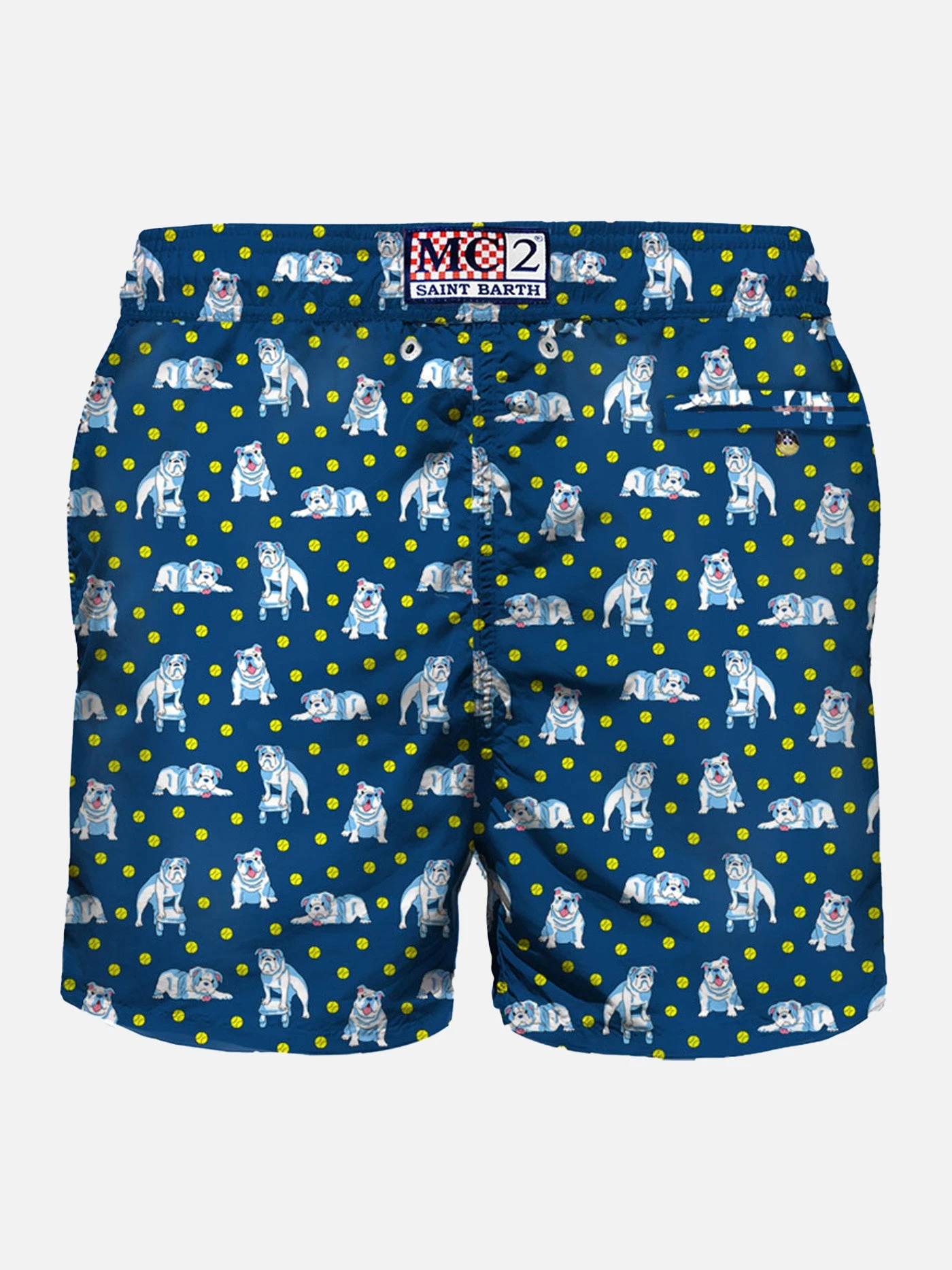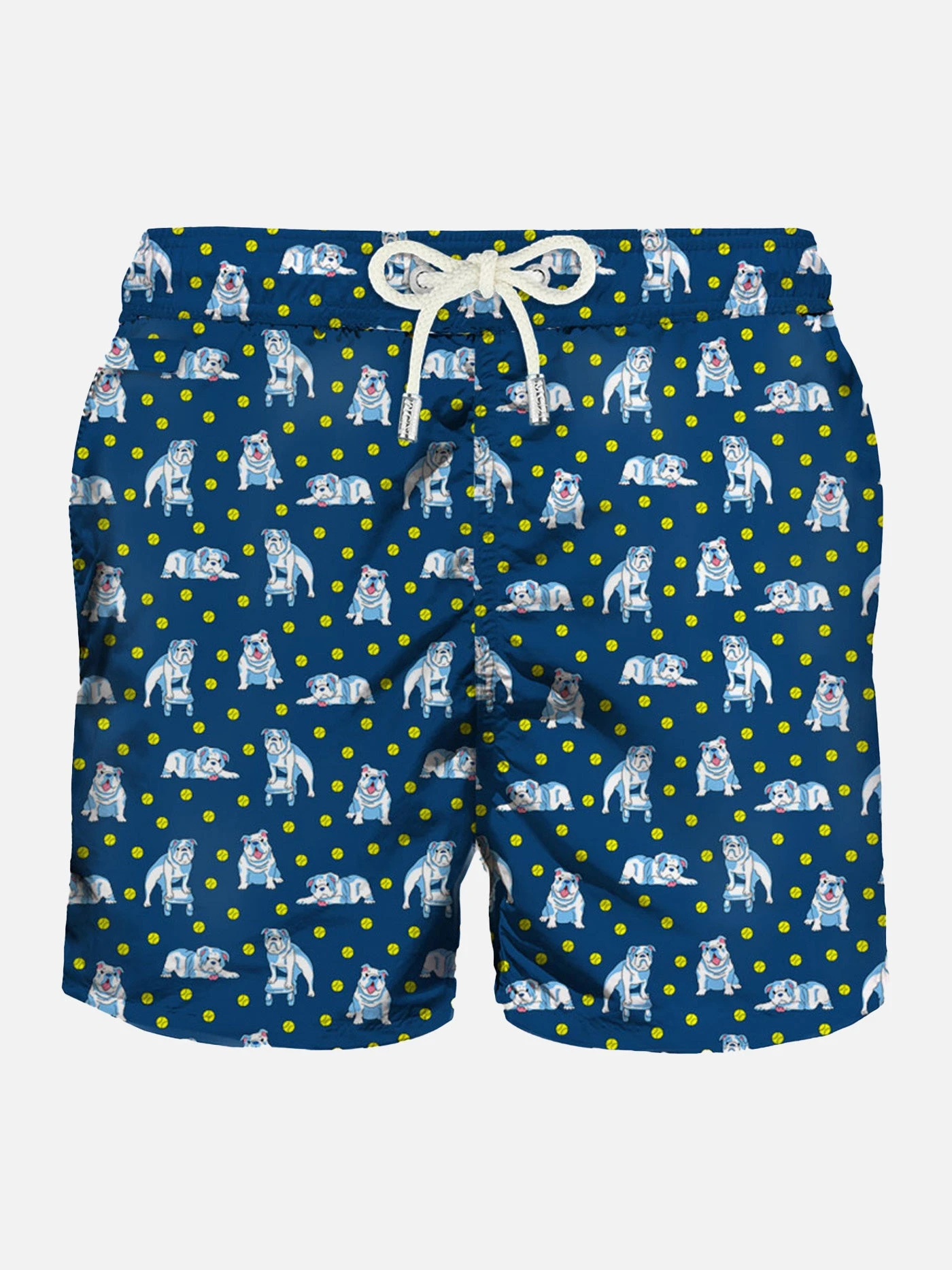 Man’s classic swim short,blue mini english bulldog print, light fabric, quick drying, mid-lenght, light net lining, elasticated waistband, drawstring fastening, front and back pocket with button.