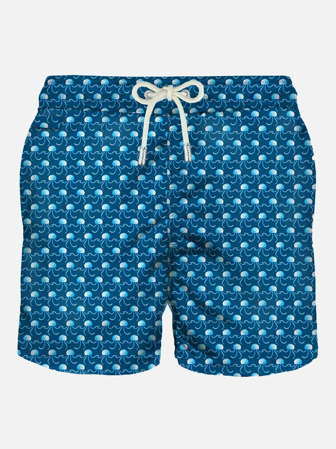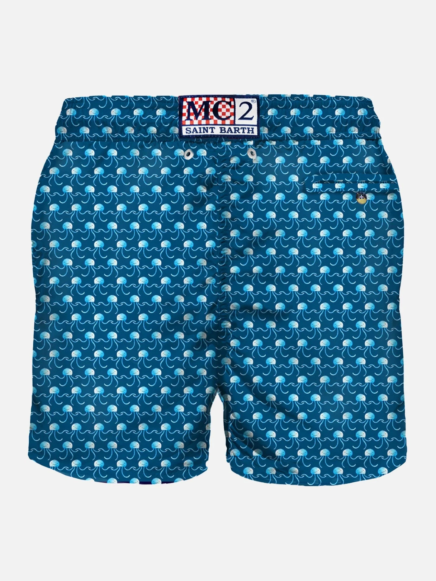 MC2 Saint Barth man’s classic swim short, light blue micro jellyfish all over print on blue backcloth, light fabric, quick drying, mid-lenght, light net lining, elasticated waistband, drawstring fastening, front and back pocket with button.