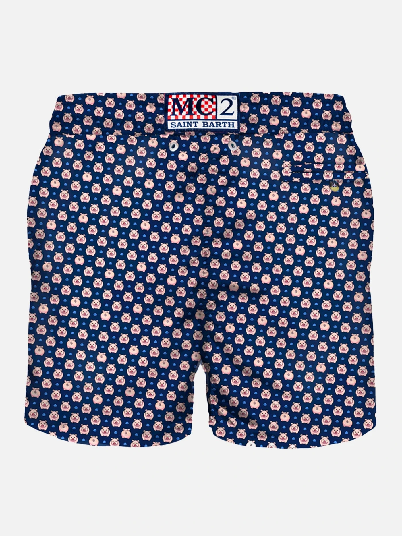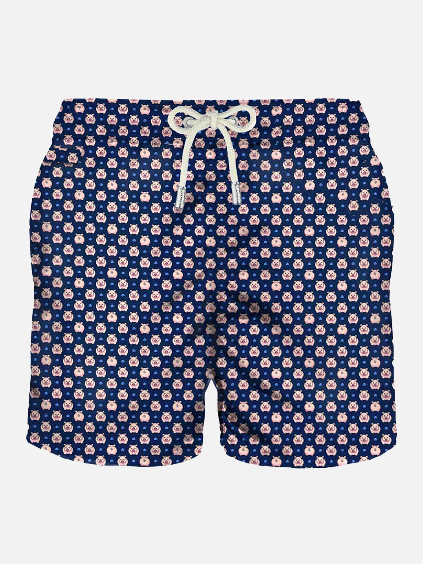 Man’s classic swim short, iconic micro piggy all over print on blue backcloth, light fabric, quick drying, mid-length, light net lining, elasticated waistband, drawstring fastening, front and back pocket with button.