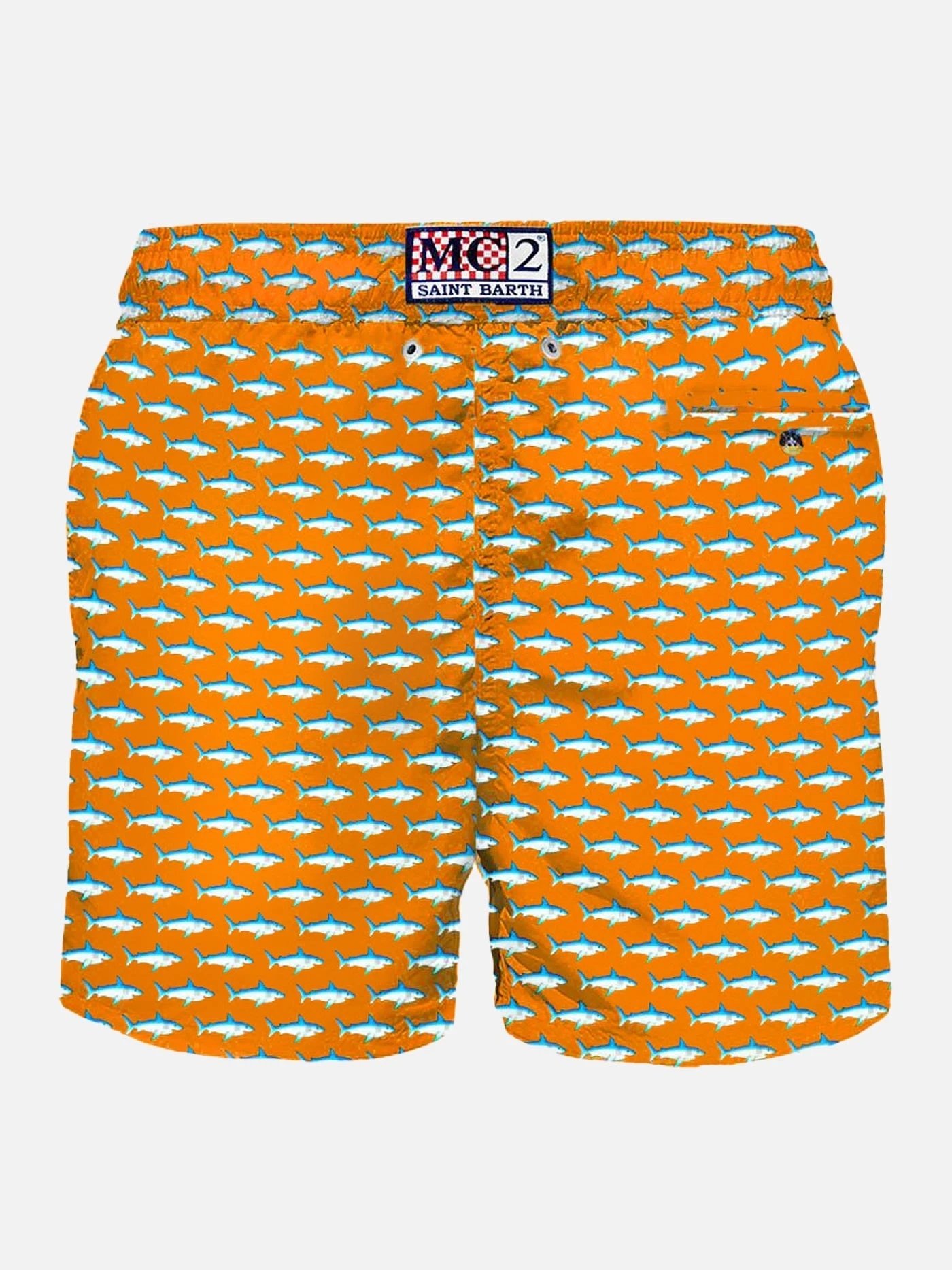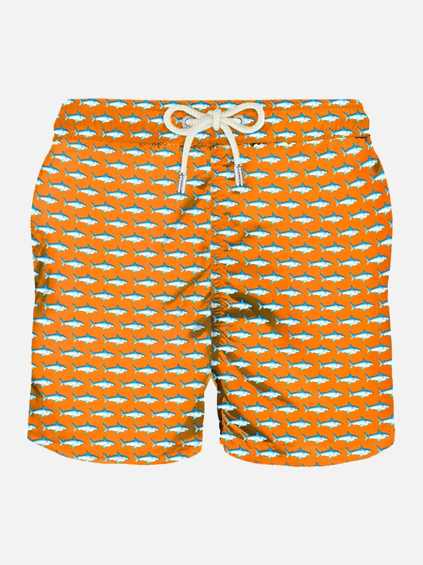MC2 Saint Barth man’s classic swim short, light blue micro sharks all over print on orange fluo backcloth, light fabric, quick drying, mid-lenght, light net lining, elasticated waistband, drawstring fastening, front and back pocket with button.