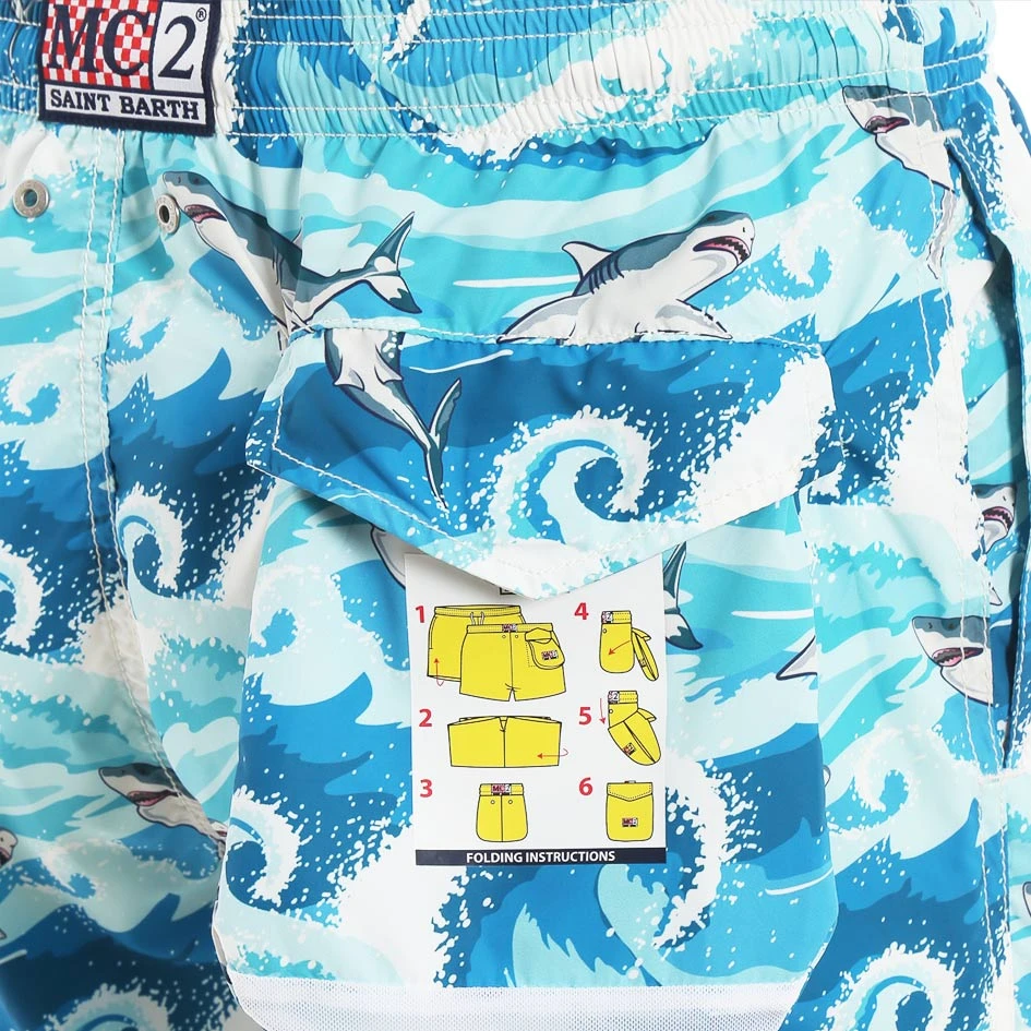Man swim trunk, light fabric, shark in the wave all over print, light blue shadows backcloth, regular fit, inside ergonomic brief, drawcord closure, backside pocket with velcro closure, pockets on both sides.