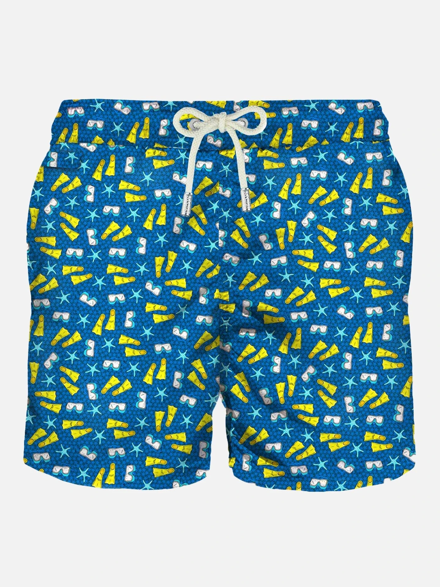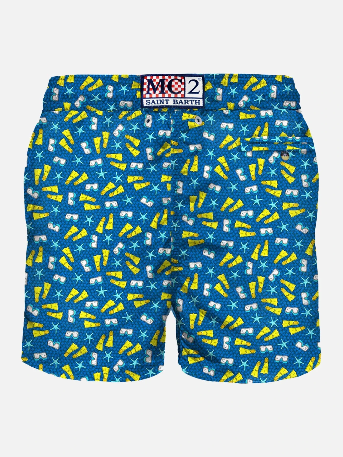 MC2 Saint Barth man’s classic swim short, yellow micro flippers, sub mask and starfish print