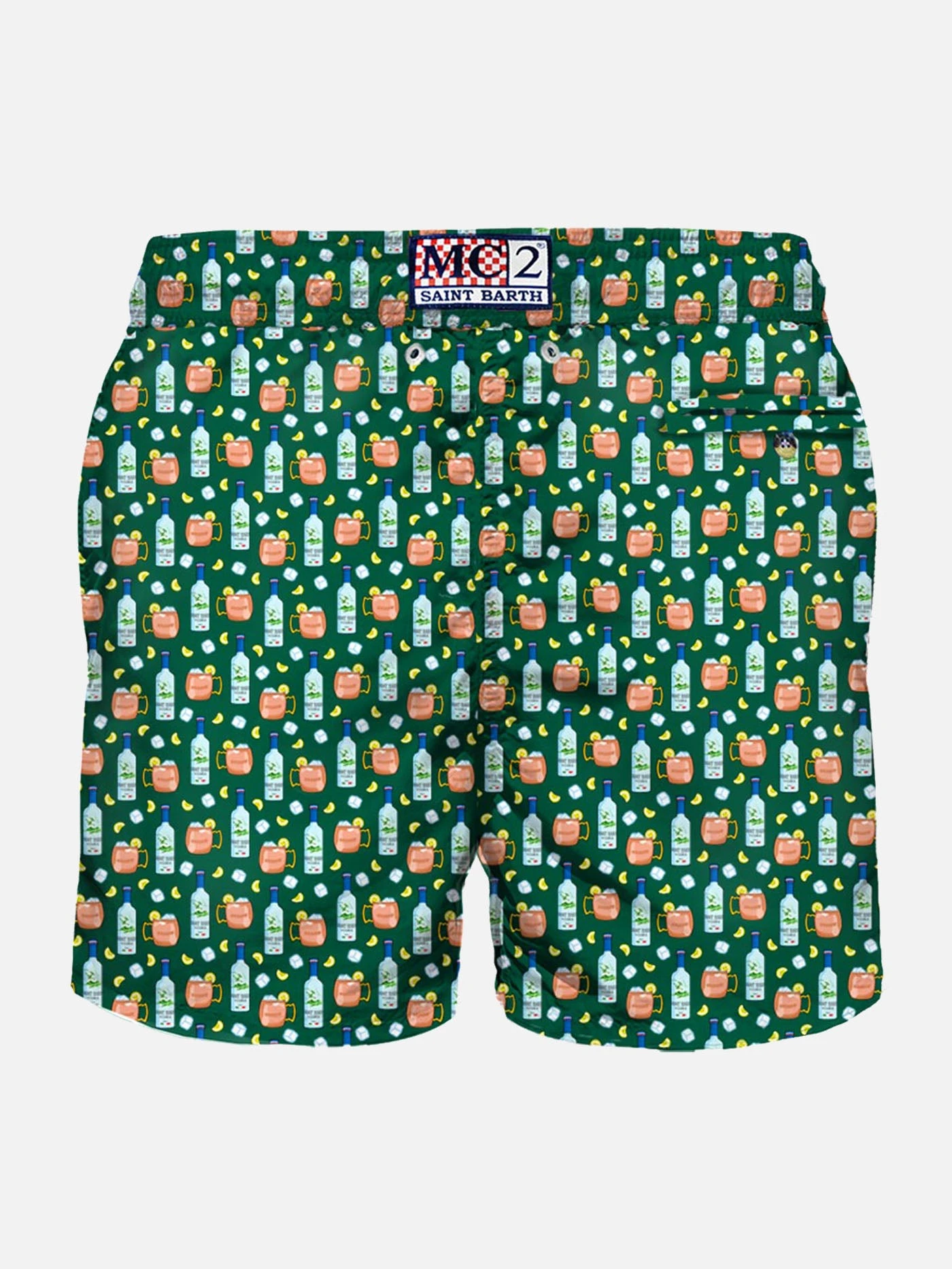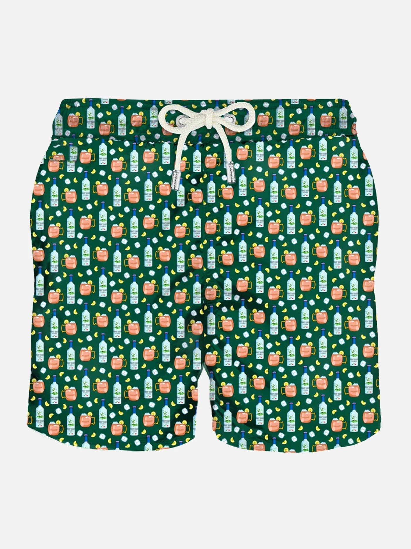Man’s classic swim short, mini Vodka mule   print, light fabric, quick drying, mid-lenght, light net lining, elasticated waistband, drawstring fastening, front and back pocket with button.