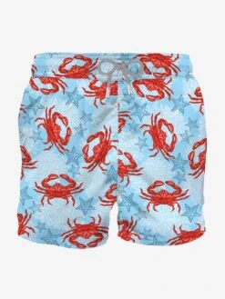 Mens Swim Shorts mid-lenght, light blue with crab print; regular fit, microfiber, inside ergonomic brief, pockets on both sides, drawcord closure, backside classic pocket with velcro closure.