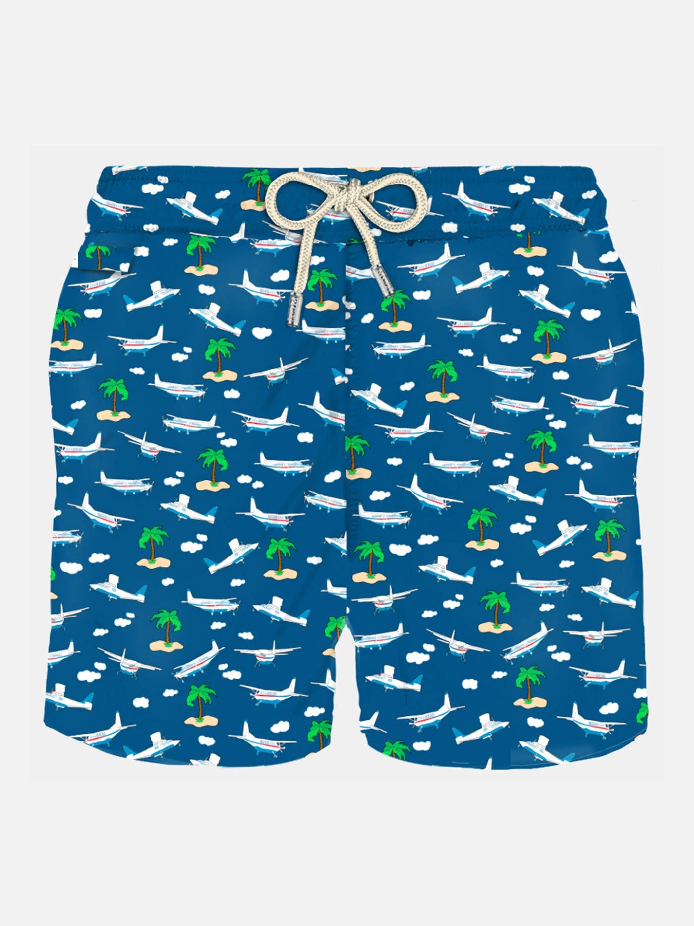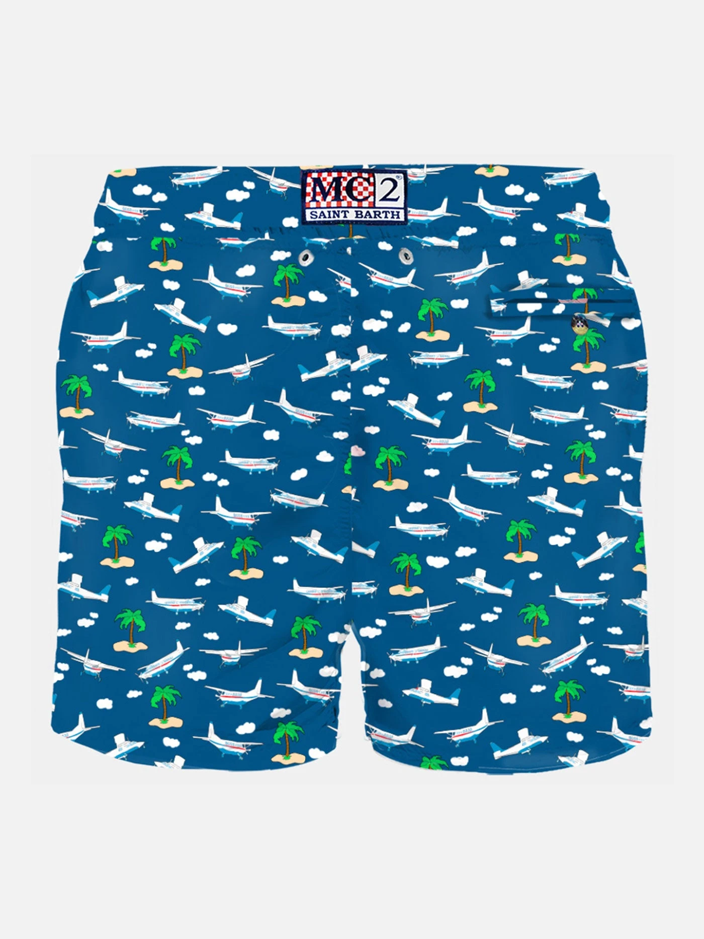 MC2 Saint Barth Man Light Fabric Swim Shorts With Plane And Island Print