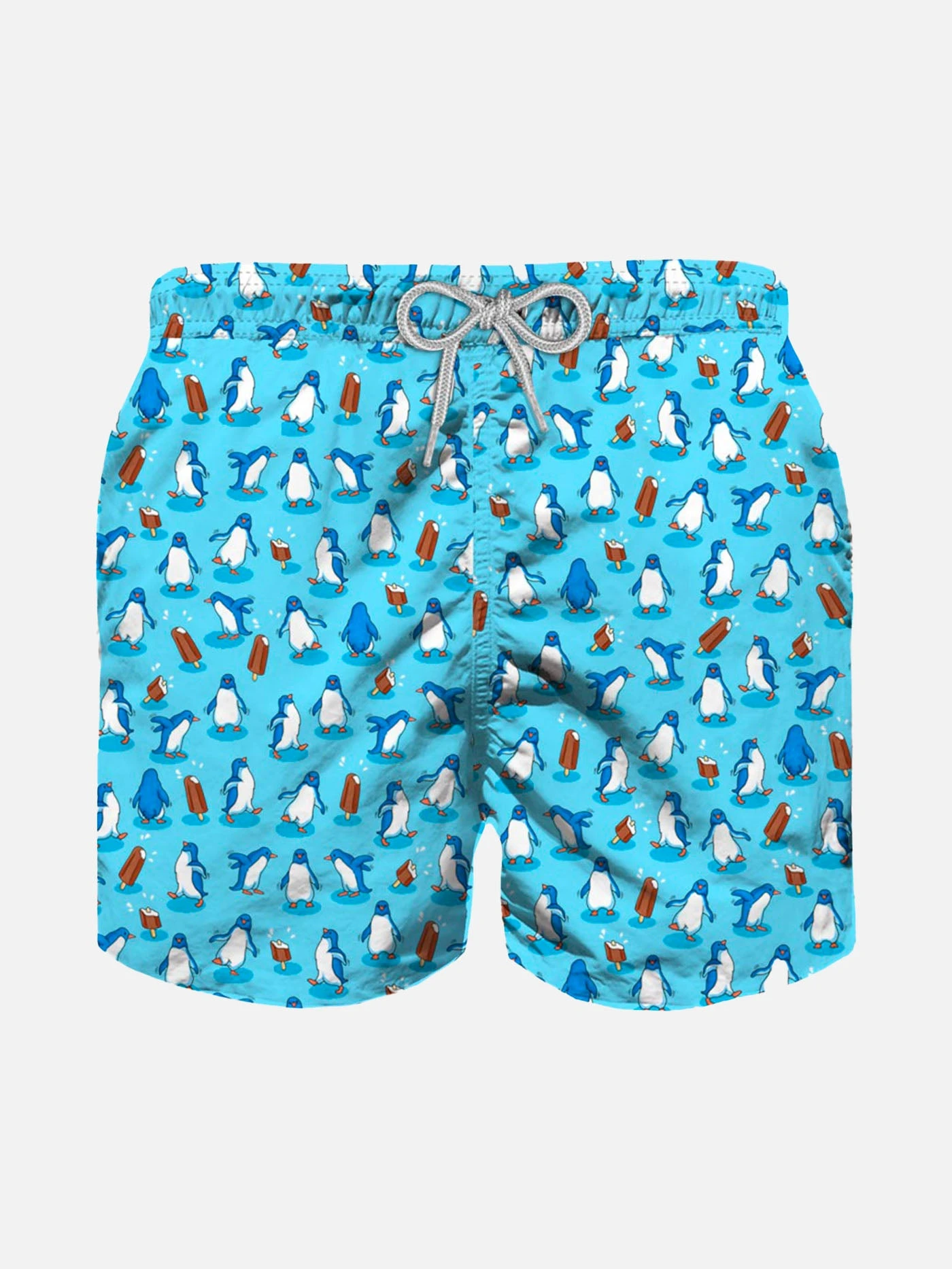 Light blue with micro penguins all over print, mid length,