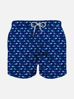 Boys’ Swim Trunks, micro sharks all over print, mid length, regular fit, printed with small shark in the water in light blue color, light fabric, fast drying, comfortable drawstring waist, inside ergonomic brief, drawcord closure, pockets on both sides, backside classic pocket with velcro closure.