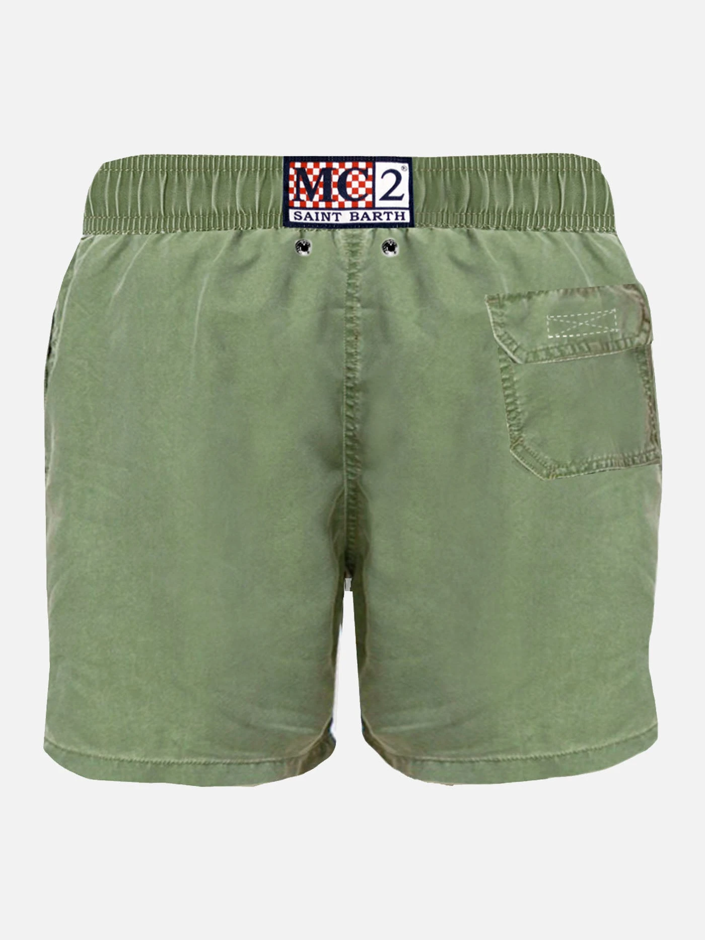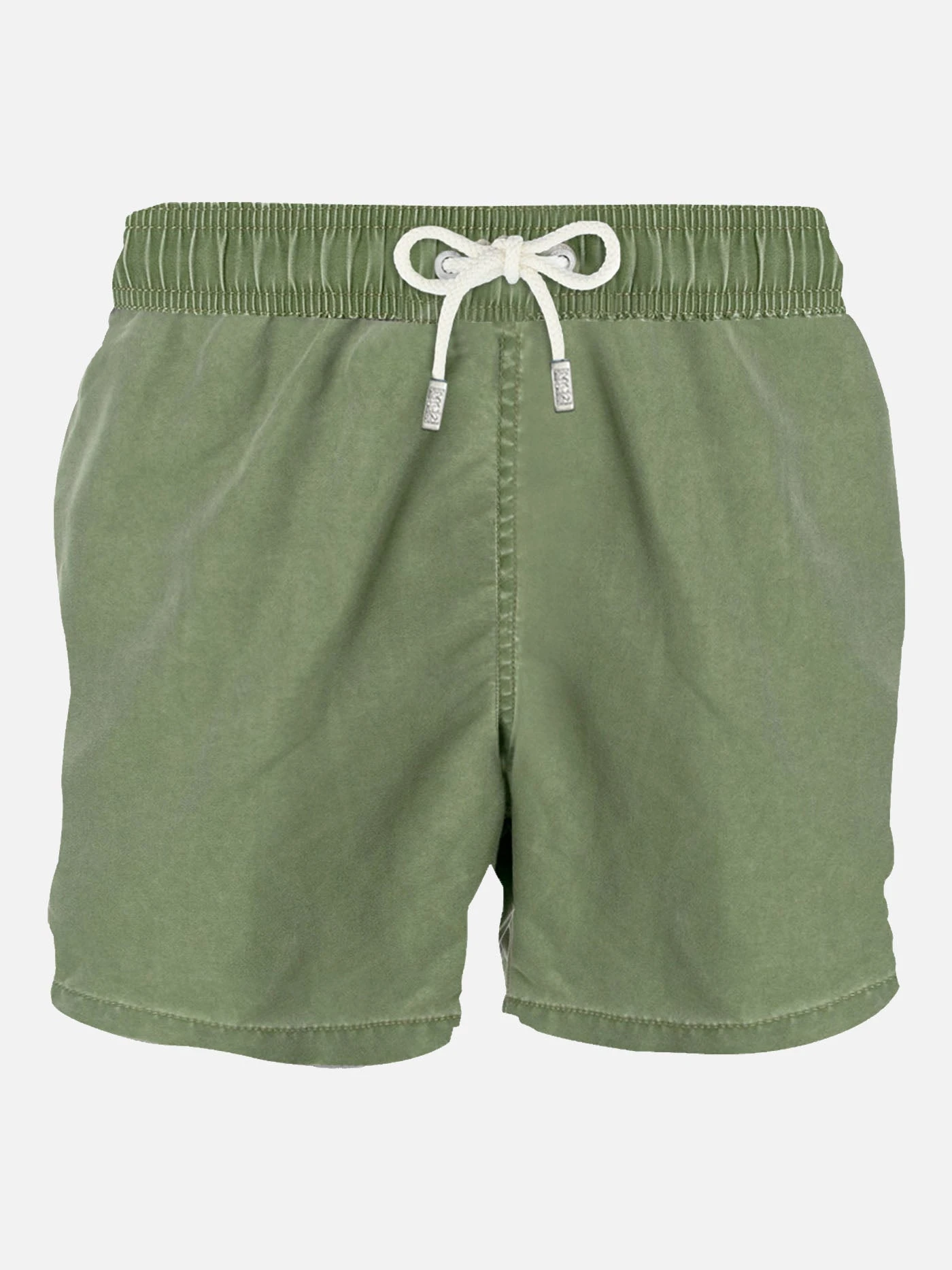 Men’s Swim Shorts mid-lenght, solid military microfibre regular fit, velvety hand feel fabric, comfortable drawstring waist, inside ergonomic brief, backside classic pocket with velcro closure.