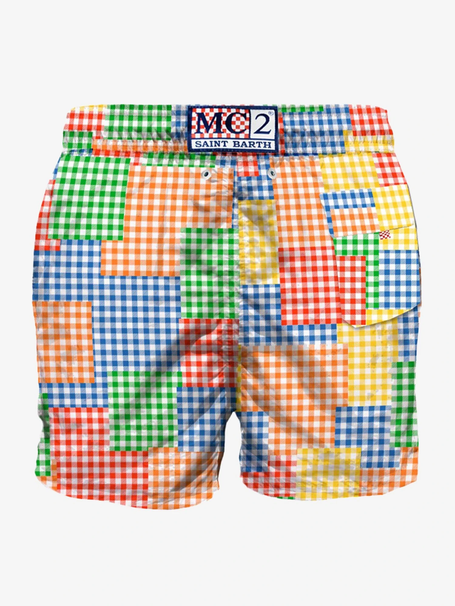 Mens Swim Shorts mid-lenght,vichy patches, regular fit, microfiber, inside ergonomic brief, pockets on both sides, drawcord closure, backside classic pocket with velcro closure.