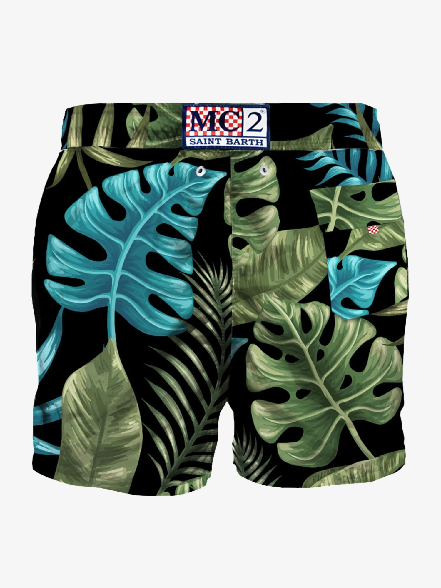 Multicolor tropical leaves print, Swim Short mid-lenght, regular fit, blue navy microfiber, comfortable drawstring waist, inside ergonomic brief, pockets on both sides, backside classic pocket with velcro closure. Model Gustavia Bahia.