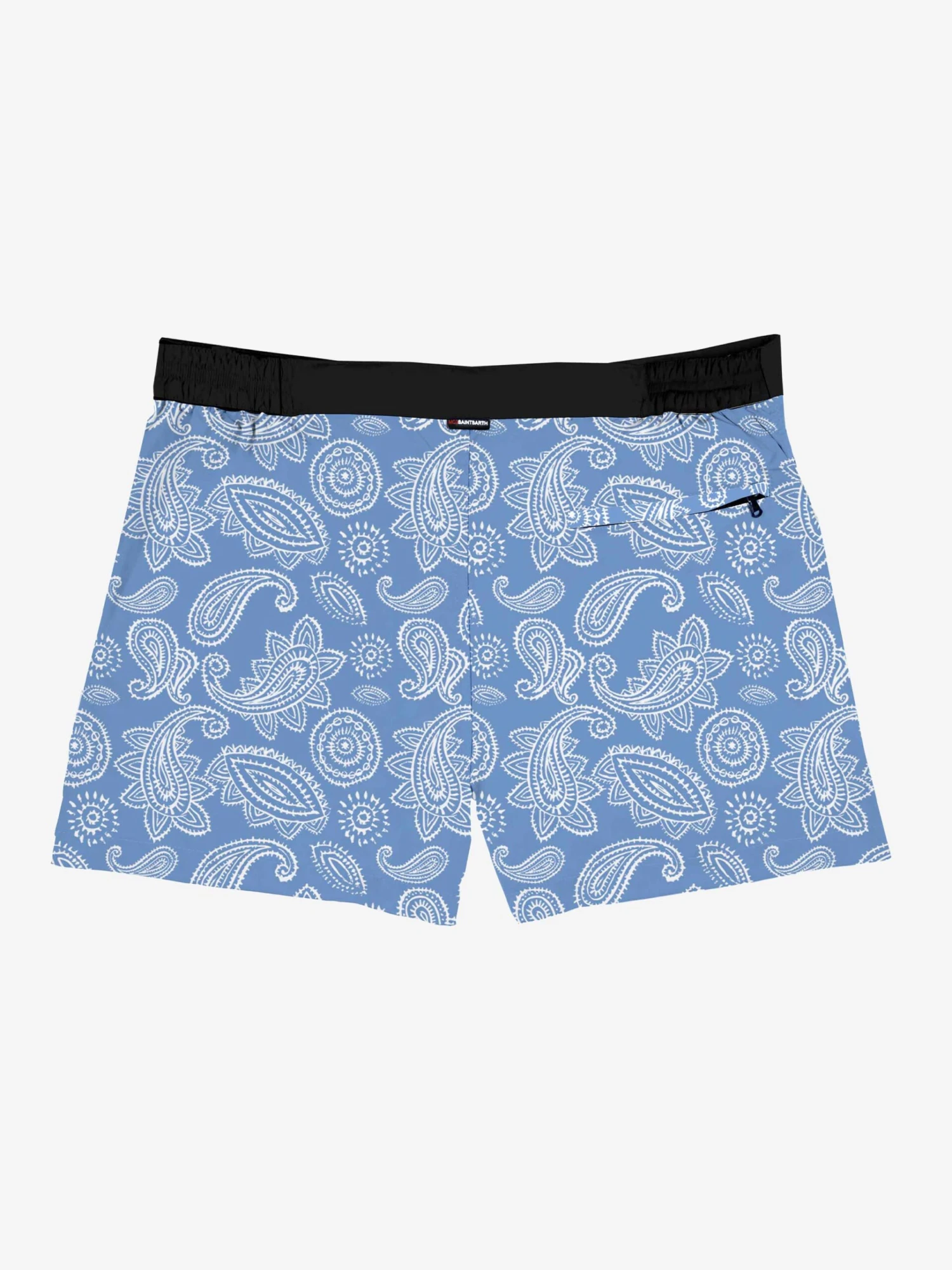 Shorter-Lenght Swim Trunks, slim fit, light blue paisley print, invisible front magnetic botton and zip closures, sides elasticated waistband for comfort, inside elasticated with buttons, light net lining, front pocket with embroidery, pockets on both sides, back pocket with zip.