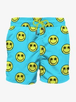 Mens Swim Shorts mid-lenght, torquoise with palm smile print, regular fit, microfiber, inside ergonomic brief, pockets on both sides, drawcord closure, backside classic pocket with velcro closure.