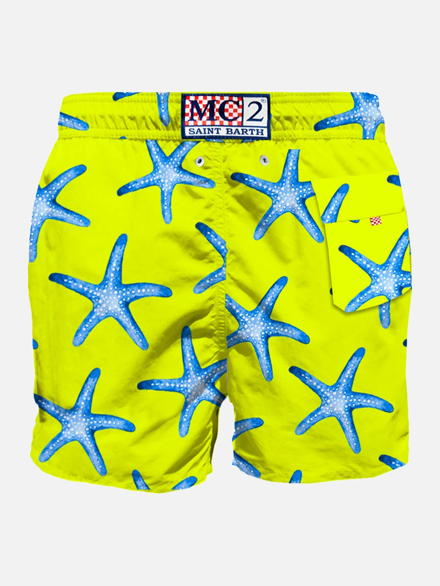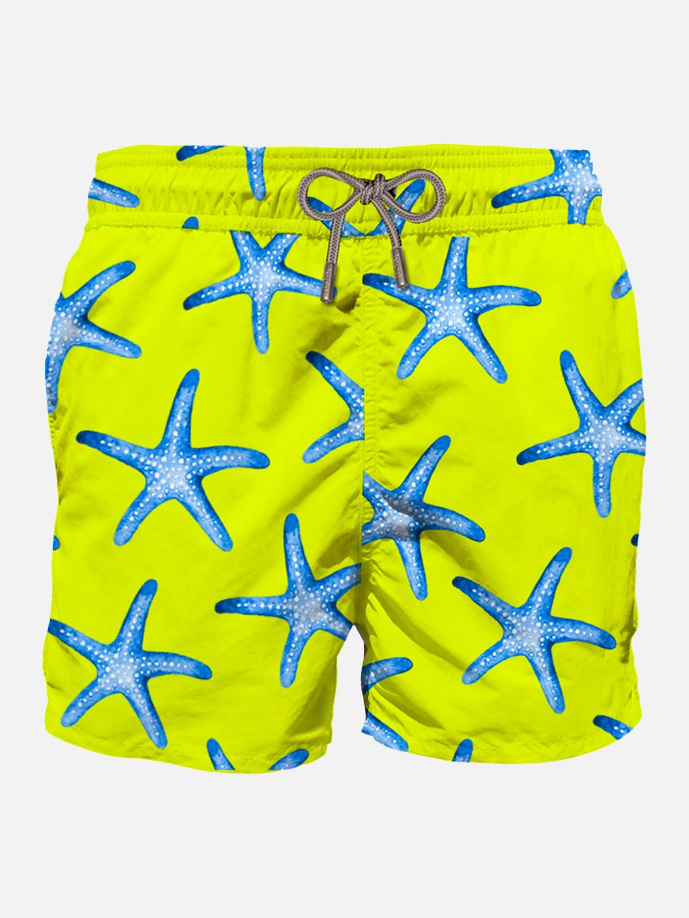 Mens Swim Shorts mid-lenght, yellow with stars print ,Ā regular fit, microfiber, inside ergonomic brief, pockets on both sides, drawcord closure, backside classic pocket with velcro closure.